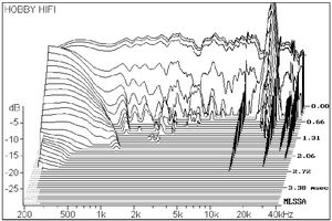 Das Wasserfallspektrum zum kleinsten Peerless-Breitbänder WB 2,00” FR/4 fehlt. Statt dessen wurde zwei mal die Sprungantwort abgedruckt. Hier liefern wir das Ausschwingverhalten des zweizölligen Breitbänders nach:
