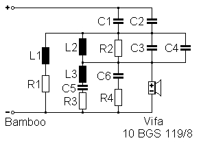 Das Korrekturnetzwerk des kreisrunden Wandlautsprechers Bamboo rutschte versehentlich über den unteren Blattrand hinaus. Natürlich reichen wir die “Frequenzweiche” dieses Lautsprechers nach: