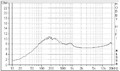 nicht zwölf Ohm. Das Impedanzdiagramm, das eine Impedanzkurve im Bereich um zwölf Ohm zeigt, wurde an einem defekten Hochtöner gemessen. Hier ist der richtige Impedanzverlauf: