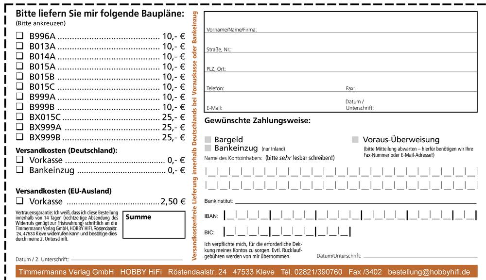 oder wenn eine breite Hörzone beschallt werden soll. Der Bauplan kostet 10 Euro, er enthält die asymmetrische Weichenschaltung, den Gehäuseplan und eine Stückliste.